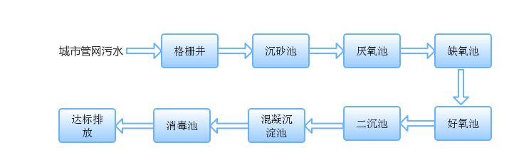 基于城市污水的特性,其工藝一般采用“格柵+沉砂池+A2/O+二沉池+絮凝沉淀+紫外消毒”。城市管網污水進入系統后,首先經過格柵井攔截大體積漂浮物,然后進入沉砂池去除夾帶的泥沙等懸浮物。沉砂池出水進入生化單元,在此單元進行脫碳、脫氮除磷,該單元分別由厭氧池、缺氧池、好氧池和二沉池構成,污水經過二沉池的泥水分離后,各項指標基本達標,但由于泥水分離不徹底,因此經過混凝沉淀,去除懸浮物和可能超標的總磷,最后經過紫外消毒,殺滅病毒病原體。