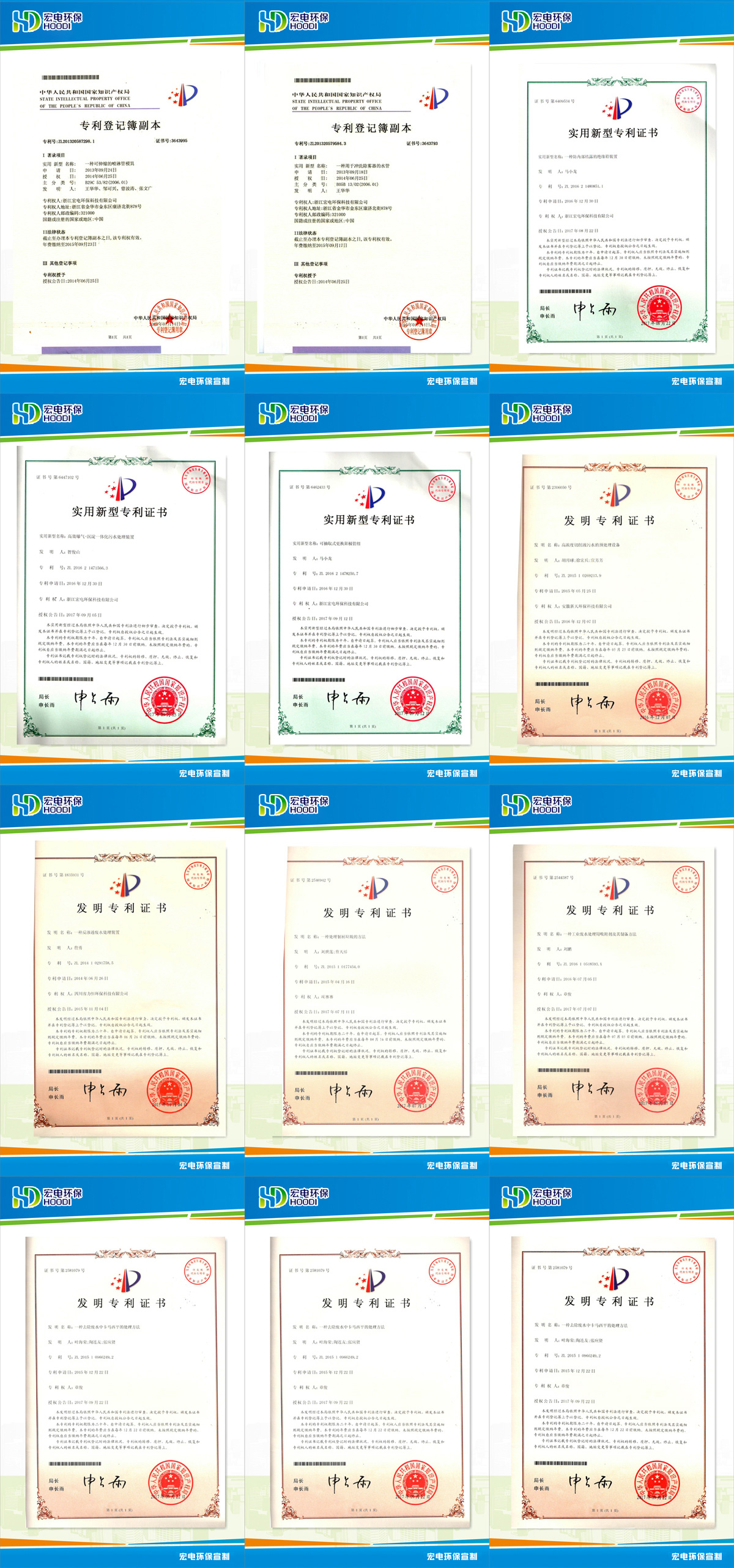 宏電環保先后被授予“國家高新技術企業”、“上市重點培育企業”、“國際生態經濟協會(EIIPA)觀察員單位”等二十余項榮譽;擁有9項發明專利、95項實用新型專利、6項軟件著作權;是青年“千人計劃”博士合作單位、百博入企合作單位。公司董事長鄒可興因在科技創新推動企業發展方面成績突出,2017年被評為金華市”首屆十大科技婺商“。